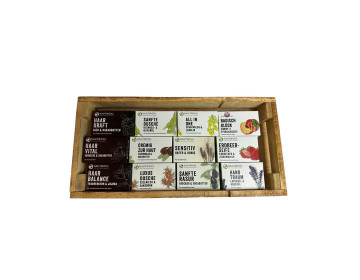 In dieser eleganten Holzkiste erhalten Sie unsere 12 beliebtesten Sorten, jeweils 3 x 80 Gramm: